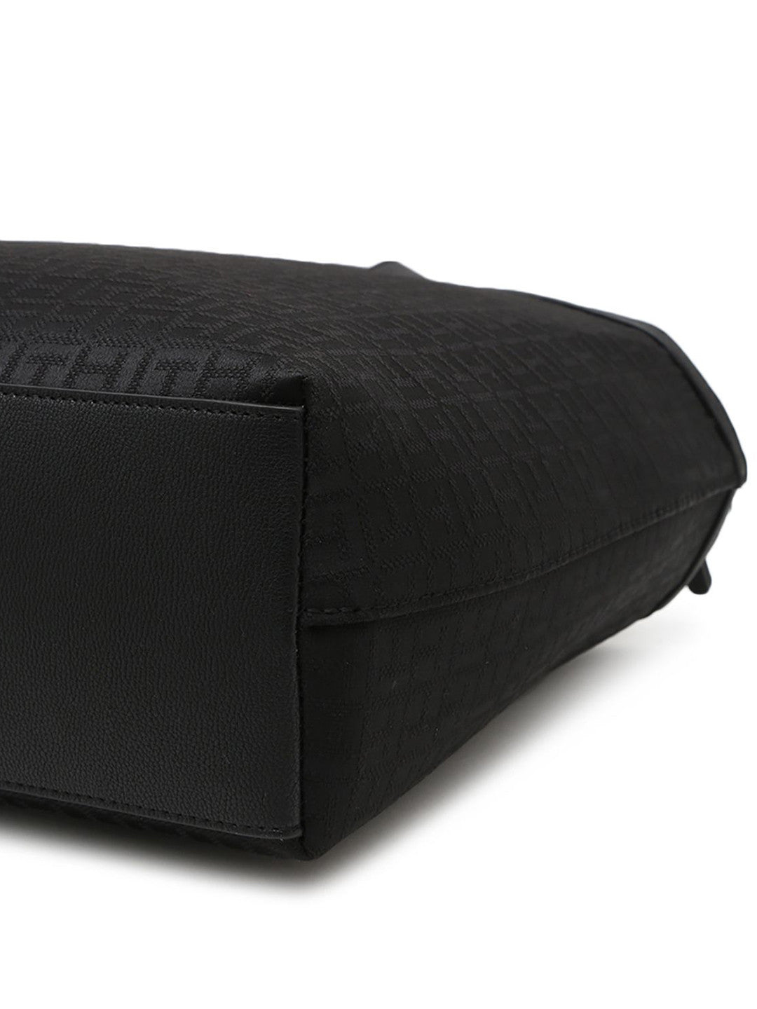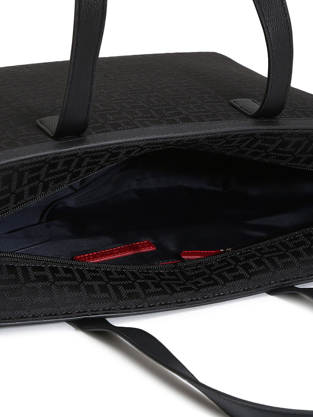 This is a Tommy Hilfiger women's black jacquard tote bag featuring a monogram pattern in black with 1 main compartment and has a zip closure.